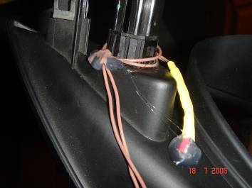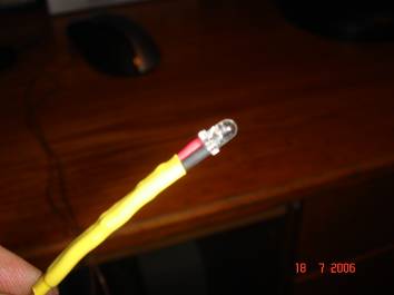 Bir bacağına 1 kohm direnç lehimlenmiş ve bacakları sıcaklıkla daralan borularla emniyete alınmış sarı bir 3mm LED. Bunu yukarıda anlattığım şekilde bağlamak gerekiyor. Yer olarak şurayı (sol altta) uygun buldum...